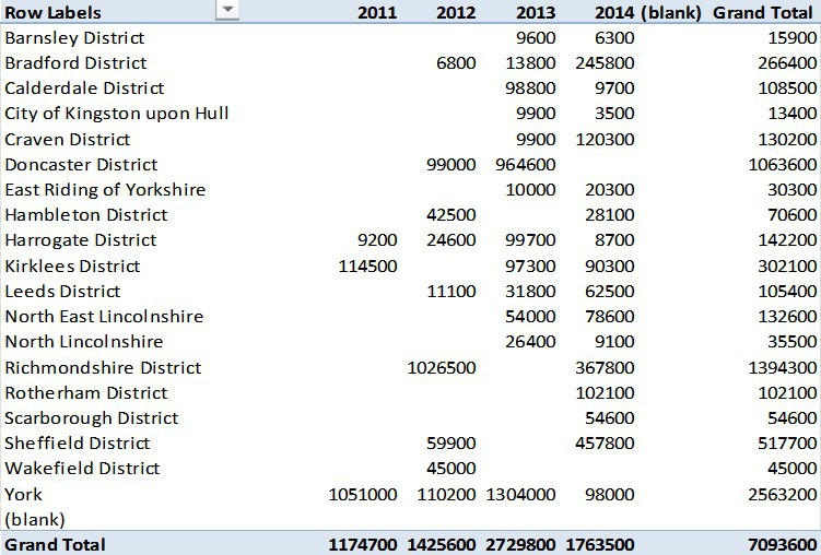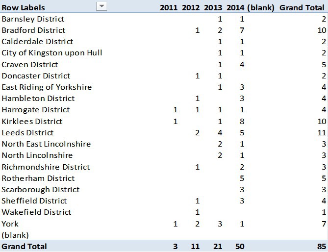 ii. Leeds received the most awards (11) between 2011 and 2014, although Kirklees received the highest number of awards (8) in a single year, 2014.